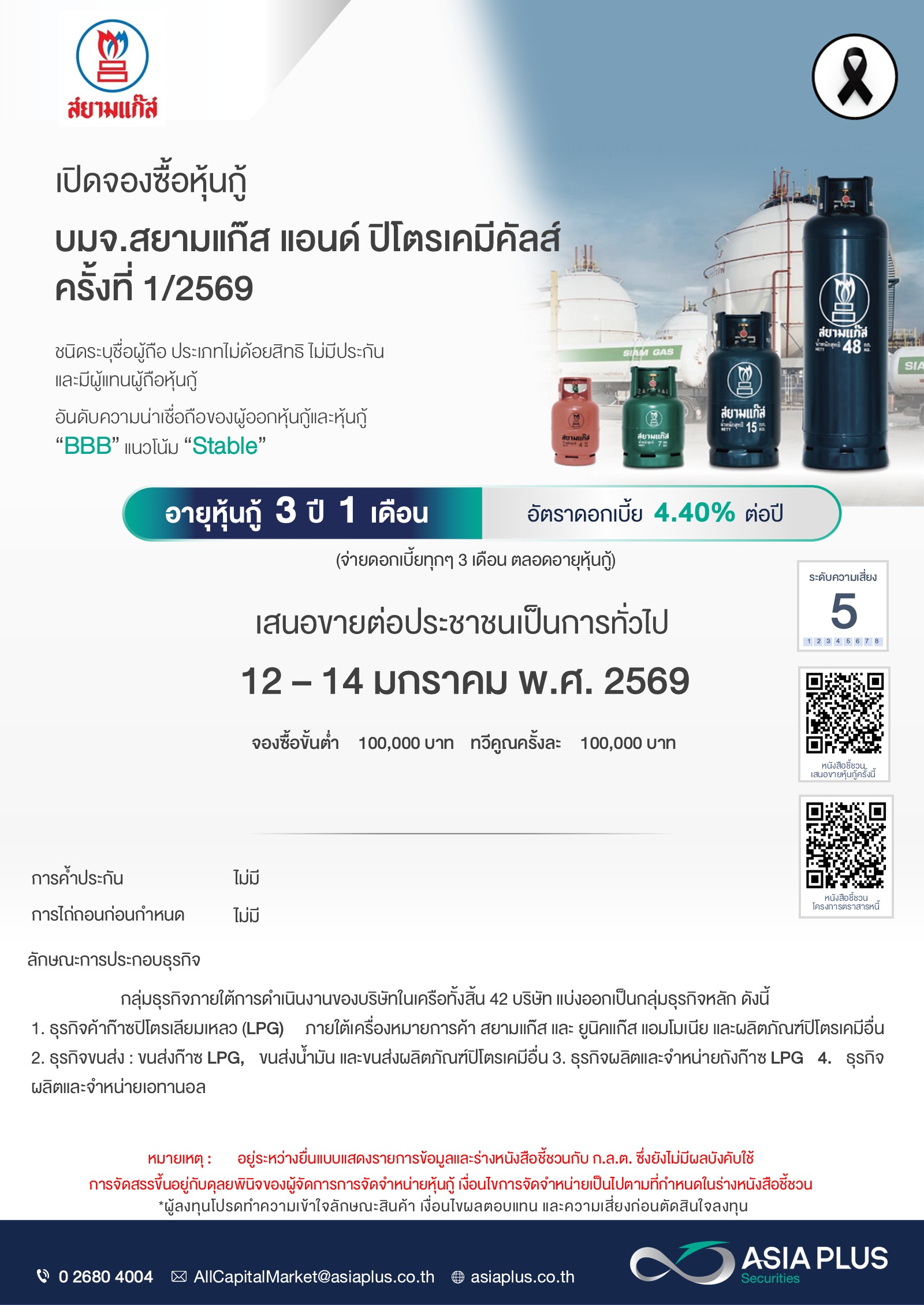 เปิดจองหุ้นกู้ บริษัท สยามแก๊ส แอนด์ ปิโตรเคมีคัลส์ จำกัด (มหาชน) - SGP