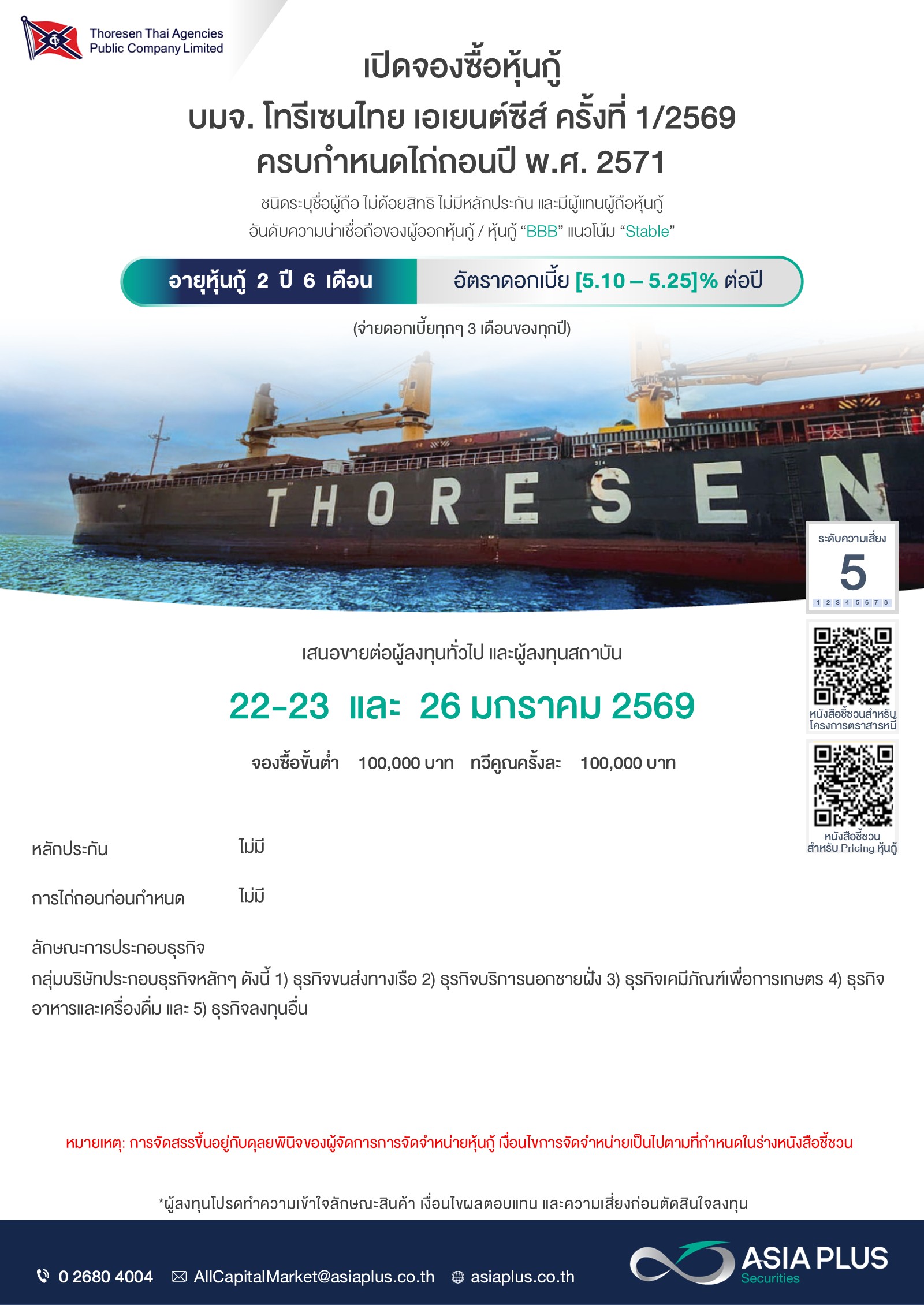 เปิดจองหุ้นกู้ บริษัท โทรีเซนไทย เอเยนต์ซีส์ จำกัด (มหาชน) - TTA
