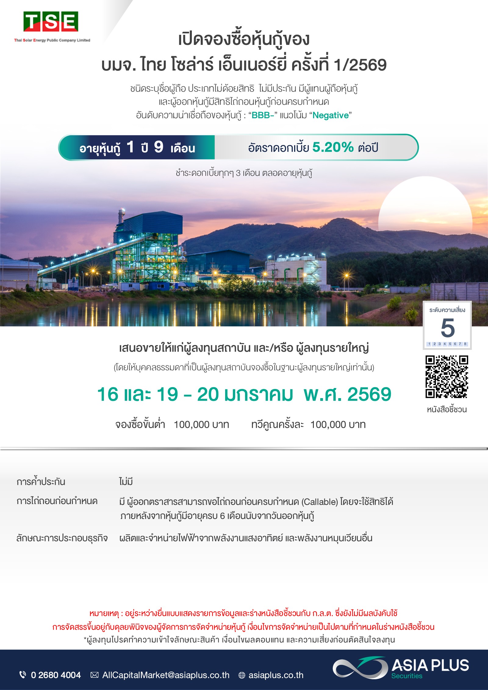 เปิดจองหุ้นกู้ บริษัท ไทย โซล่าร์ เอ็นเนอร์ยี่ จำกัด (มหาชน) - TSE