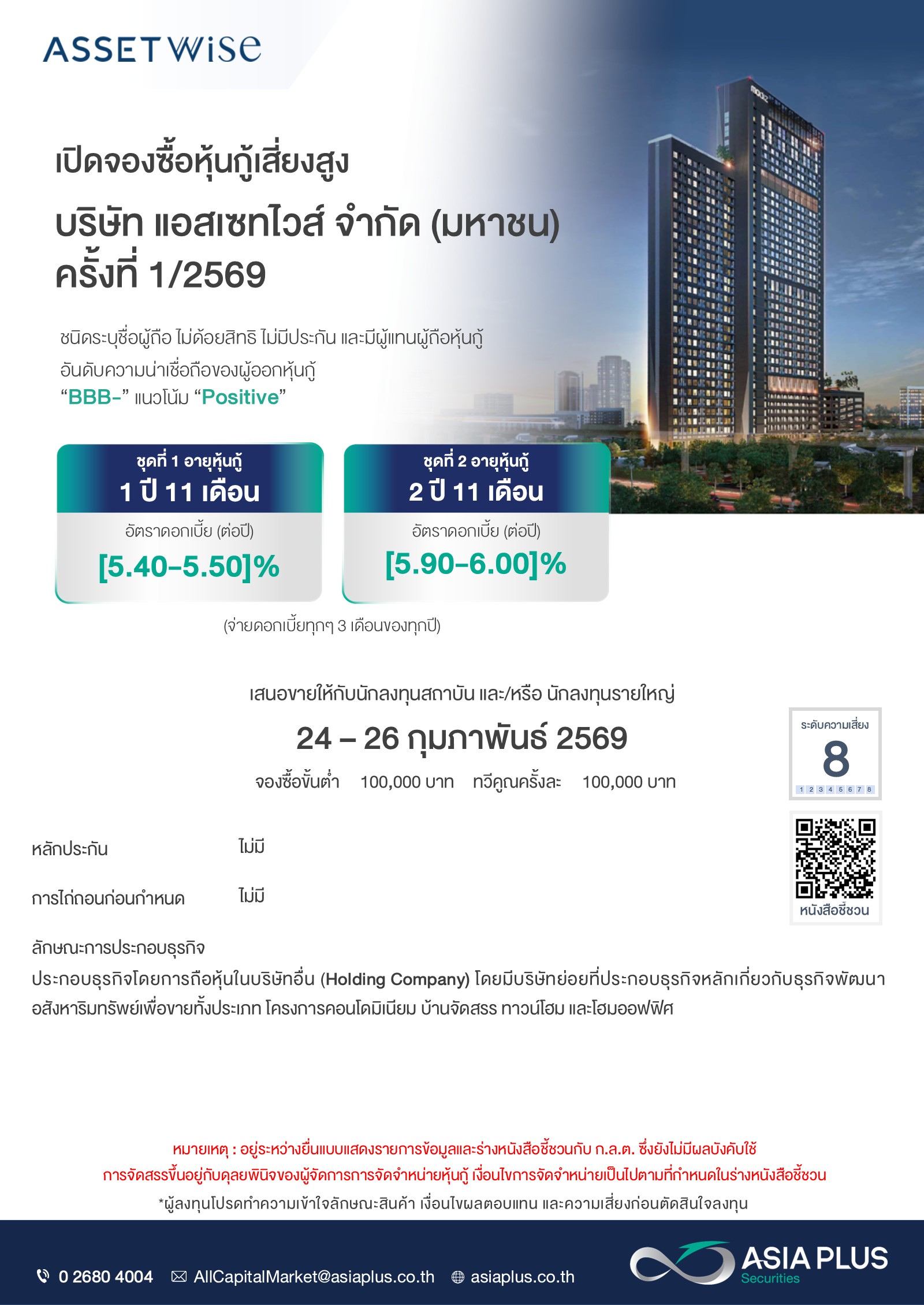 เปิดจองหุ้นกู้เสี่ยงสูง บริษัท แอสเซทไวส์ จำกัด (มหาชน) - ASW